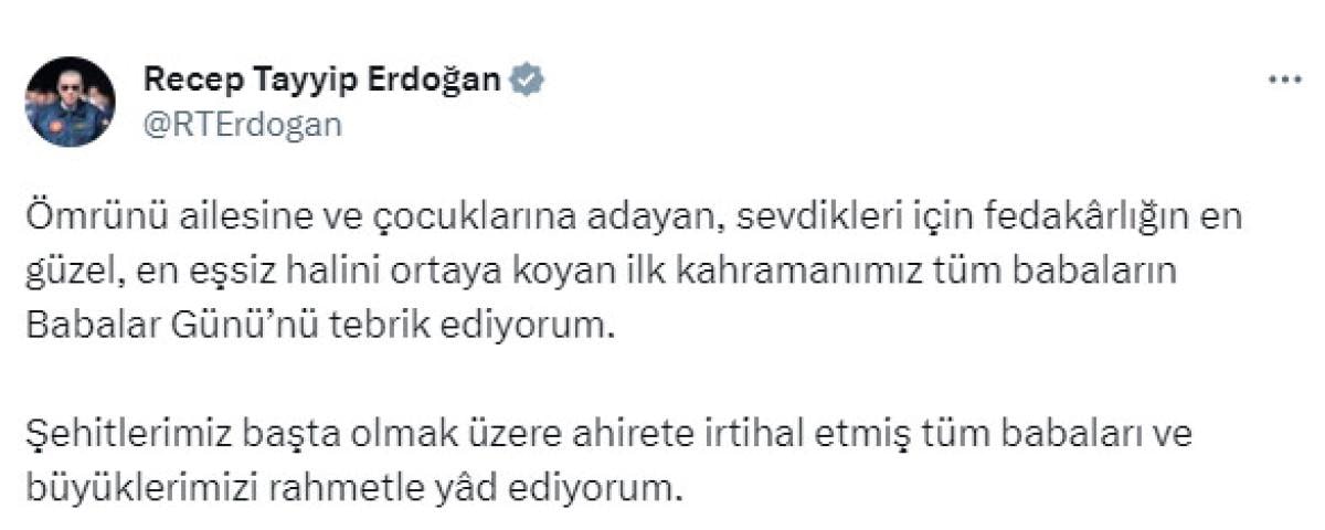 Cumhurbaşkanı Erdoğan, mesajında, "Ömrünü ailesine ve çocuklarına adayan, sevdikleri için fedakarlığın en güzel, en eşsiz halini ortaya koyan ilk kahramanımız tüm babaların Babalar Günü’nü tebrik ediyorum." diye yazdı.
