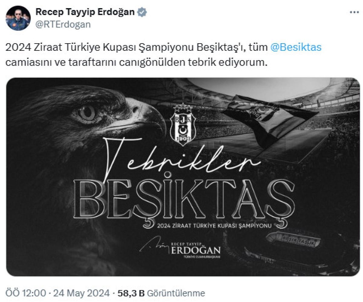 2024 Ziraat Türkiye Kupası Şampiyonu Beşiktaş'ı, tüm Beşiktaş camiasını ve taraftarını canıgönülden tebrik ediyorum.