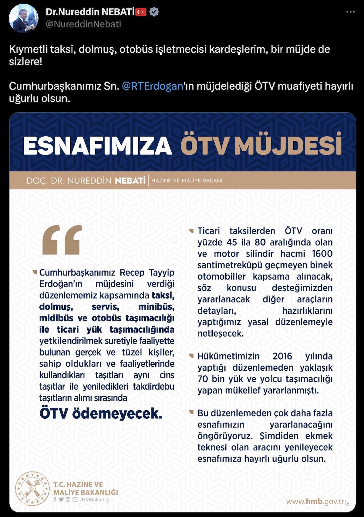 Nebati paylaşımında, "Kıymetli taksi, dolmuş, otobüs işletmecisi kardeşlerim, bir müjde de sizlere! Cumhurbaşkanımız Sn. Recep Tayyip Erdoğan'ın müjdelediği ÖTV muafiyeti hayırlı uğurlu olsun." dedi.