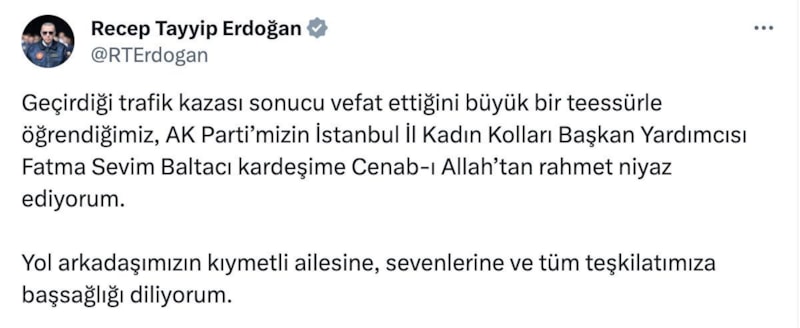Cumhurbaşkanı Recep Tayyip Erdoğan, AK Parti İstanbul İl Kadın Kolları Başkan Yardımcısı Fatma Sevim Baltacı'nın vefatının ardından yayınladığı başsağlığı mesajında şu ifadeleri kullandı: