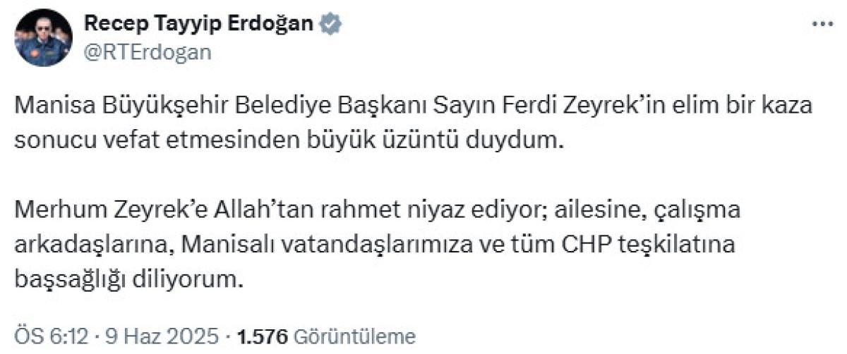 Merhum Zeyrek’e Allah’tan rahmet niyaz ediyor; ailesine, çalışma arkadaşlarına, Manisalı vatandaşlarımıza ve tüm CHP teşkilatına başsağlığı diliyorum.