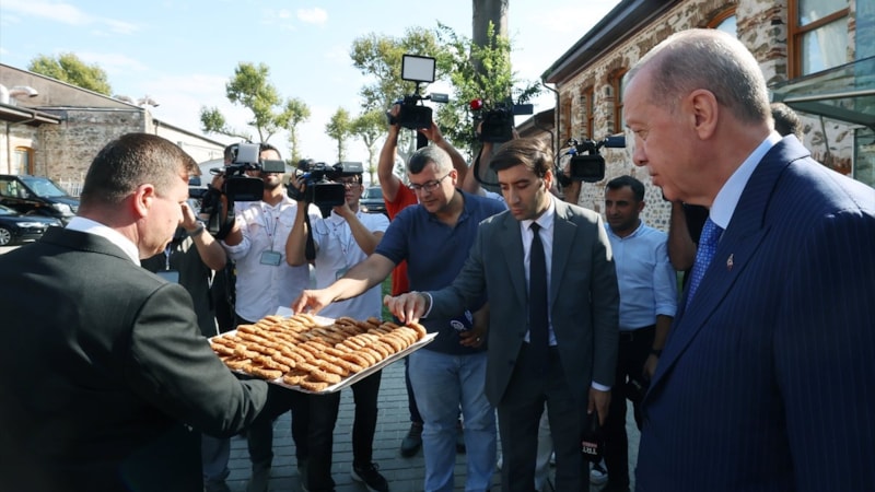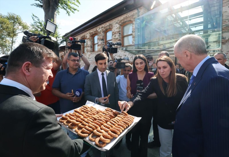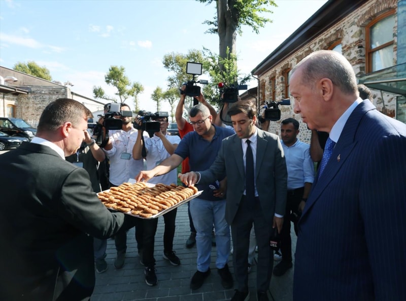 Cumhurbaşkanı Erdoğan, Mevlid Kandili nedeniyle programı takip eden gazetecilere kandil simidi dağıttı.
