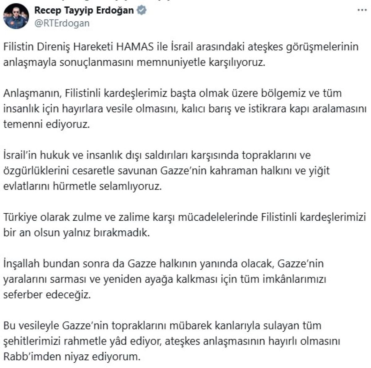 Sosyal medya hesabından yaptığı paylaşımda, Filistin Direniş Hareketi Hamas ile İsrail arasındaki ateşkes görüşmelerinin anlaşmayla sonuçlanmasını memnuniyetle karşıladıklarını belirten Cumhurbaşkanı Erdoğan, açıklamasının devamında şu ifadelere yer verdi:
