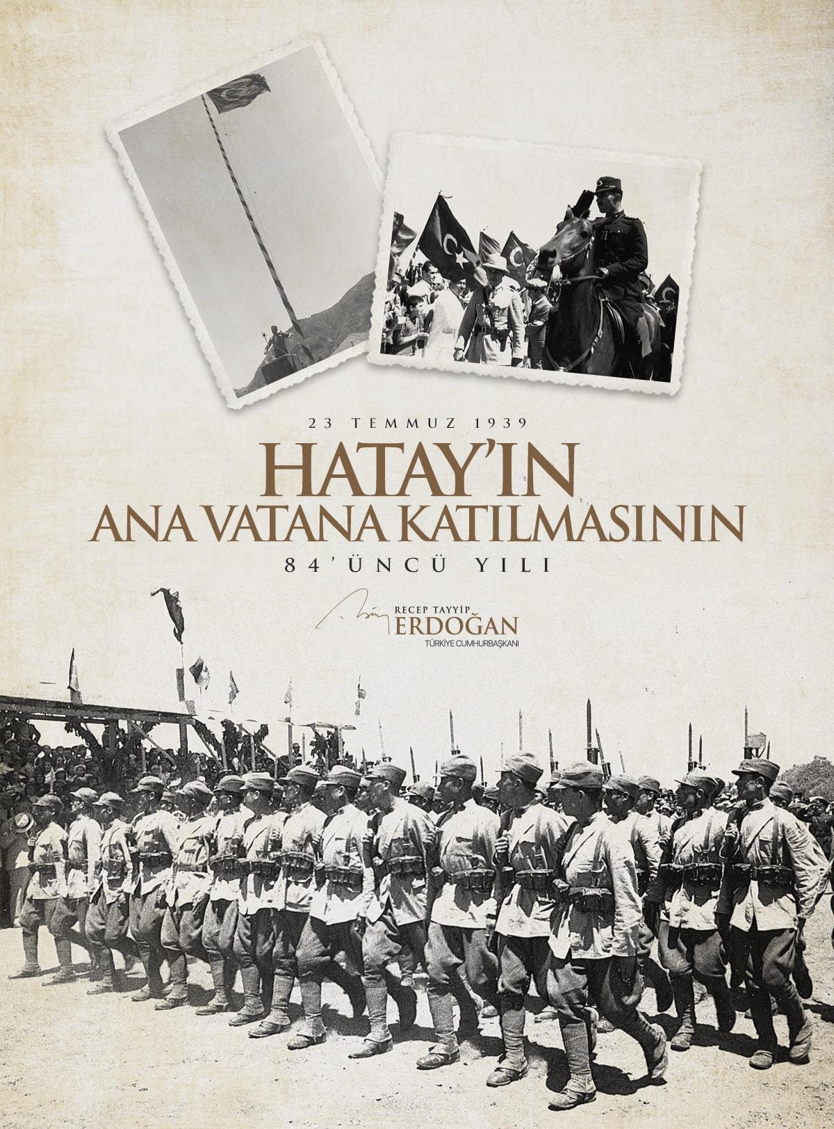 Asırlardır medeniyetlere ev sahipliği yapan Hatay’ımızın ana vatana katılmasının 84’üncü yıl dönümünü tebrik ediyorum. Sürdürmekte olduğumuz yoğun çalışmalarla, 6 Şubat depremlerinin Hatay'ımızla birlikte 11 ilimizde yol açtığı yaraları sarıyoruz. İnşallah kadim şehrimiz Hatay’ımızı tarihî dokusuna uygun şekilde, çok kısa bir sürede yeniden inşa ve ihya edecek, Hataylı kardeşlerimizin her türlü sıkıntısını çözüme kavuşturacağız. Bu vesileyle, "şahsi meselem" diyerek Hatay'a verdiği ehemmiyeti çok net bir şekilde ortaya koyan Gazi Mustafa Kemal ile bu millî dava için çabalayan herkesi rahmetle, şükranla yâd ediyorum. Hataylı tüm kardeşlerimi en kalbi duygularımla selamlıyorum.
