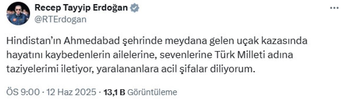 Hindistan’ın Ahmedabad şehrinde meydana gelen uçak kazasında hayatını kaybedenlerin ailelerine, sevenlerine Türk Milleti adına taziyelerimi iletiyor, yaralananlara acil şifalar diliyorum.