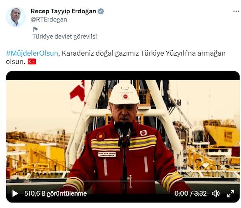 Cumhurbaşkanı Recep Tayyip Erdoğan, saat 19.23'te yaptığı paylaşımında "Müjdeler olsun, Karadeniz doğal gazımız Türkiye Yüzyılı'na armağan olsun." ifadelerini kullandı.
