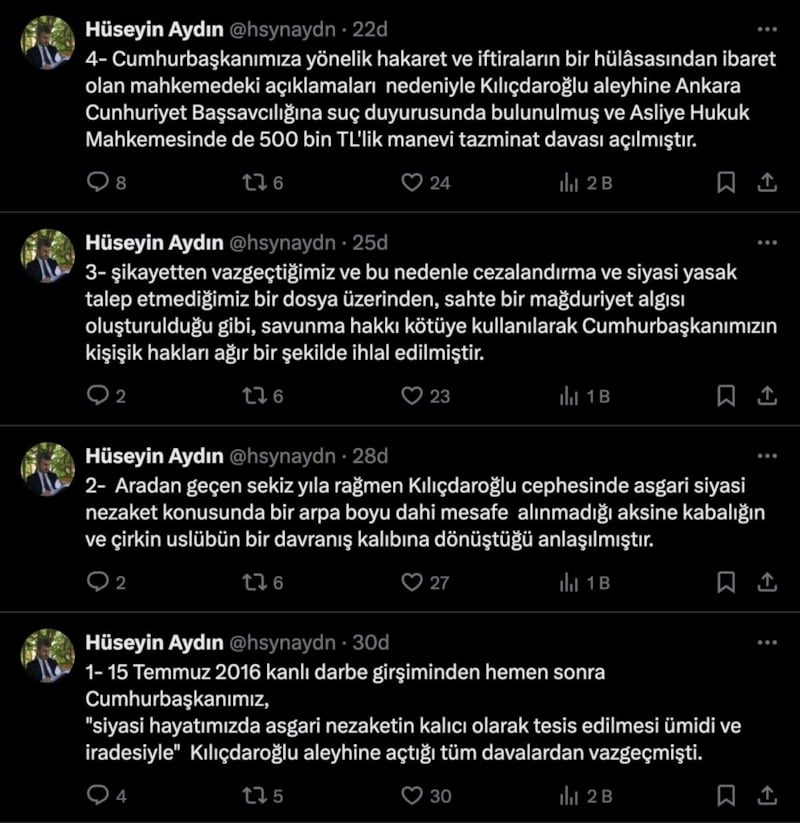 3- Şikayetten vazgeçtiğimiz ve bu nedenle cezalandırma ve siyasi yasak talep etmediğimiz bir dosya üzerinden, sahte bir mağduriyet algısı oluşturulduğu gibi, savunma hakkı kötüye kullanılarak Cumhurbaşkanımızın kişilik hakları ağır bir şekilde ihlal edilmiştir.