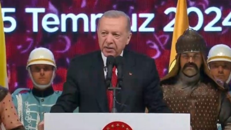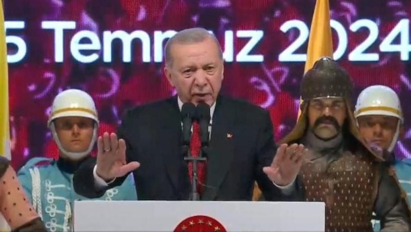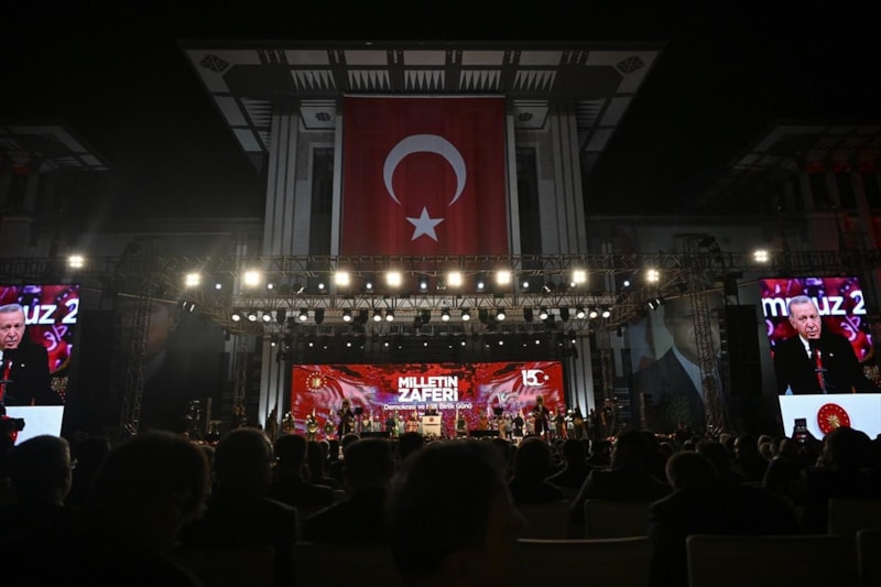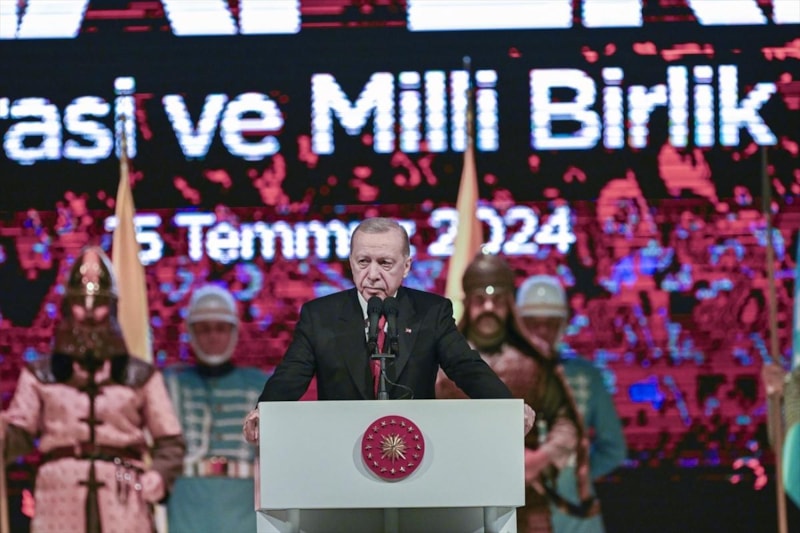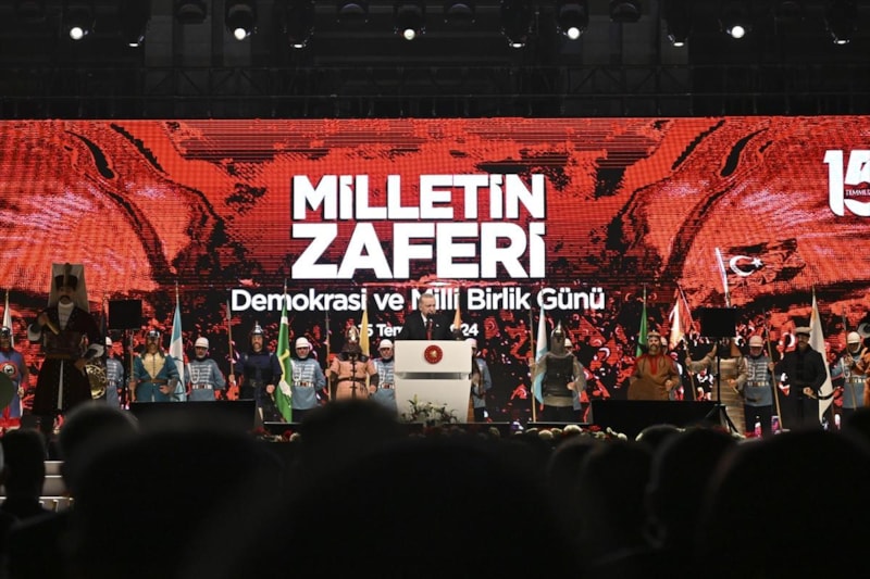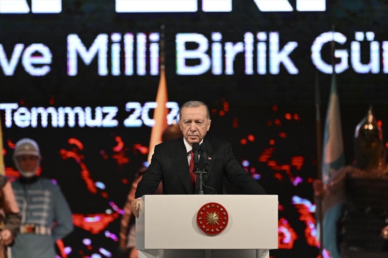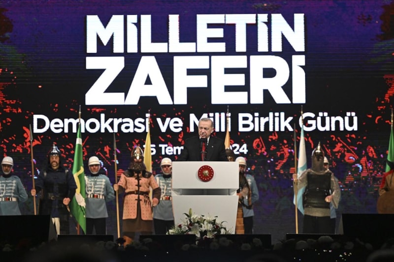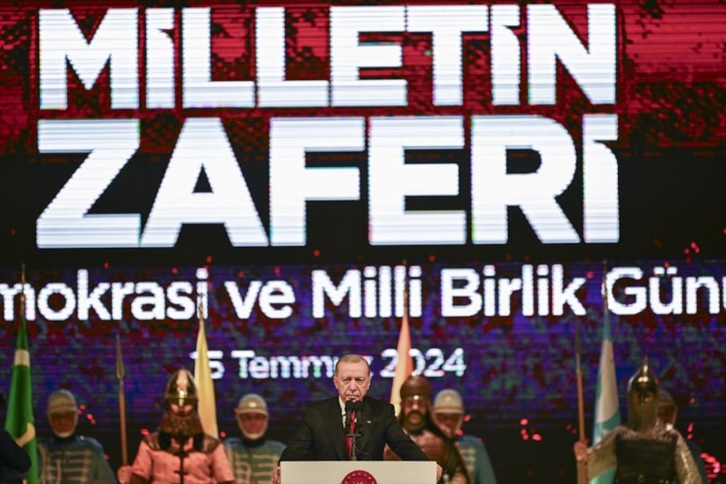 Cumhurbaşkanı Recep Tayyip Erdoğan, 15 Temmuz'un 8. yıldönümünde Cumhurbaşkanlığı Külliyesi'nde halka hitap etti.