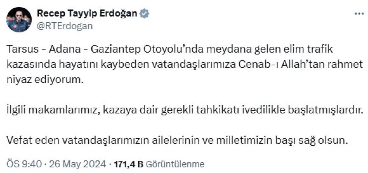 Tarsus - Adana - Gaziantep Otoyolu’nda meydana gelen elim trafik kazasında hayatını kaybeden vatandaşlarımıza Cenab-ı Allah’tan rahmet niyaz ediyorum.
