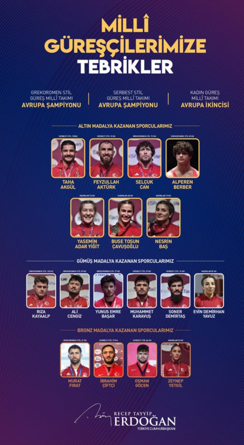 "Avrupa Güreş Şampiyonası'nda hem serbest stil hem de grekoromende Avrupa Şampiyonu olan Erkek Milli Takımımızla birlikte Avrupa İkincisi olan Kadın Milli Takımımızı en kalbi duygularımla tebrik ediyorum. 7 altın, 6 gümüş, 4 bronz olmak üzere toplam 17 madalya kazanarak ülkemize büyük bir gurur yaşatan milli güreşçilerimize gönülden teşekkür ediyorum."