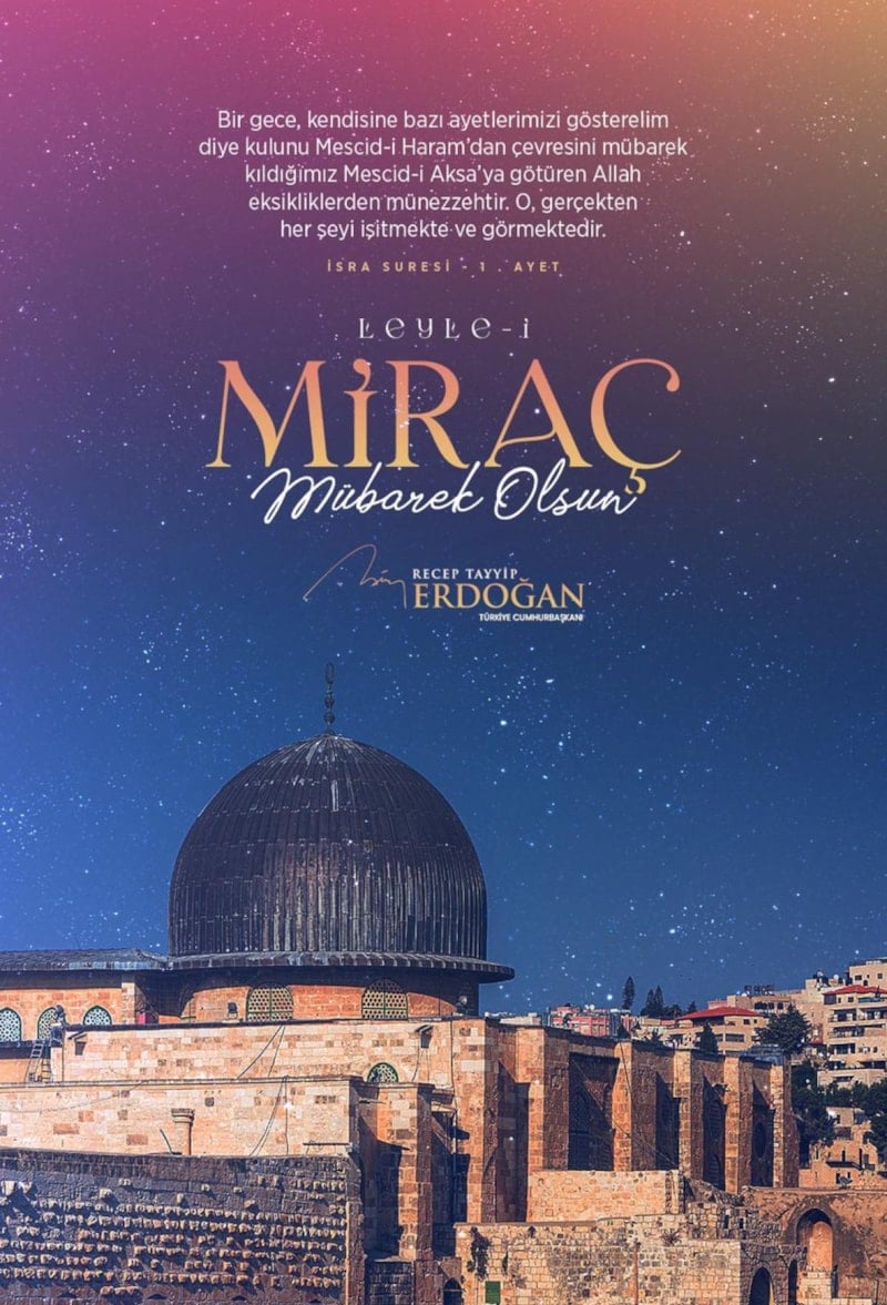 Aziz milletimizin ve İslam âleminin Leyle-i Miraç’ını tebrik ediyor, bu rahmet ve hikmet dolu gecenin Filistinli kardeşlerimiz başta olmak üzere tüm insanlık için huzura ve refaha vesile olmasını Allah’tan niyaz ediyorum. Gecemiz mübarek olsun…