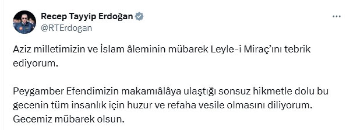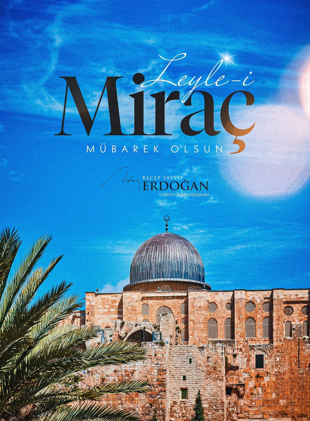 Tüm İslam aleminin Miraç Kandili'ni tebrik eden Cumhurbaşkanı Erdoğan, şu ifadeleri kullandı:
