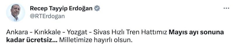 Cumhurbaşkanı Erdoğan sosyal medya hesabından yaptığı açıklamada Ankara- Sivas YHT Hattı'nın mayıs ayı sonuna kadar ücretsiz olacağını duyurdu.