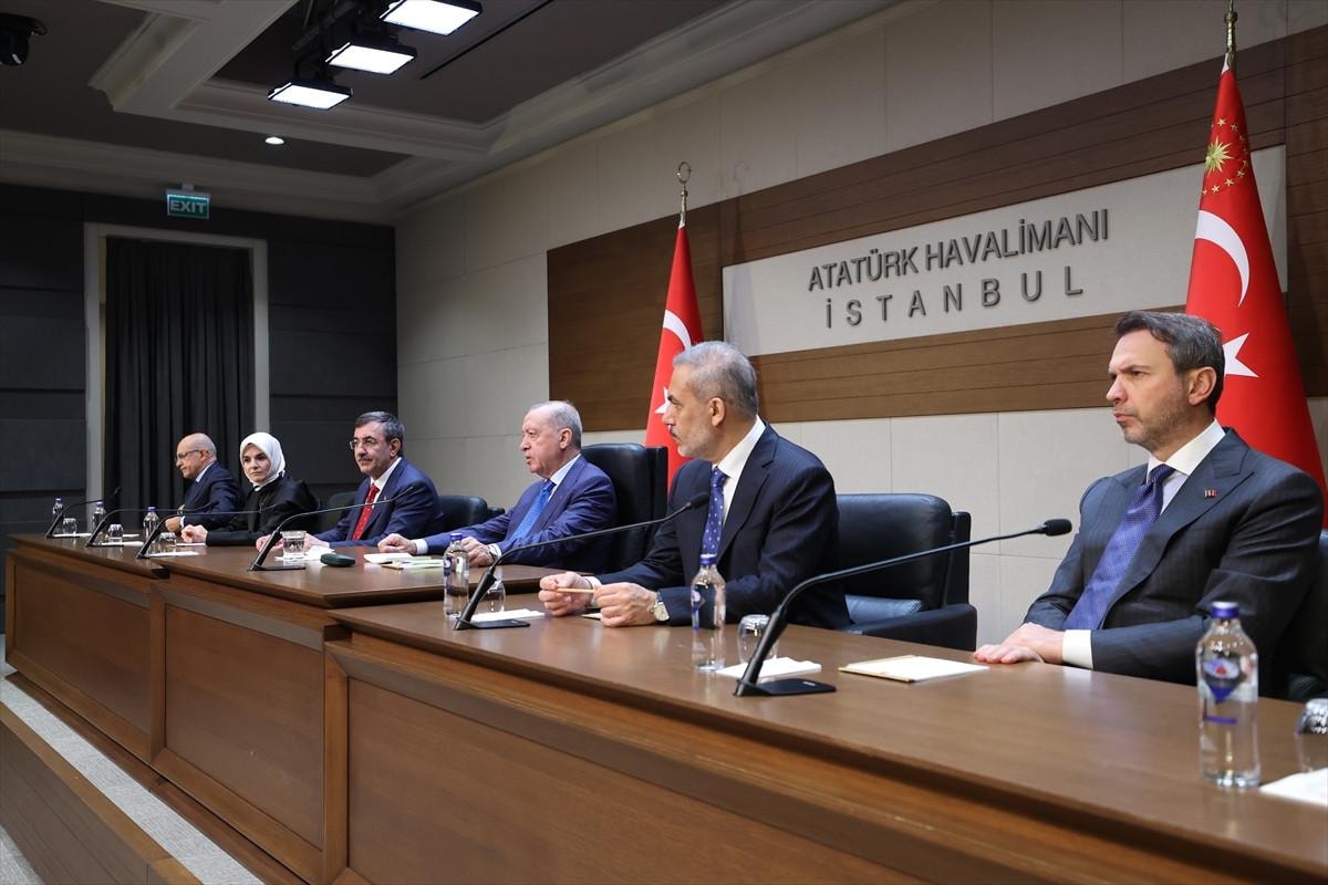 Cumhurbaşkanı Erdoğan, yolculuk öncesi Atatürk Havalimanı'nda gazetecilerin sorularını yanıtladı.