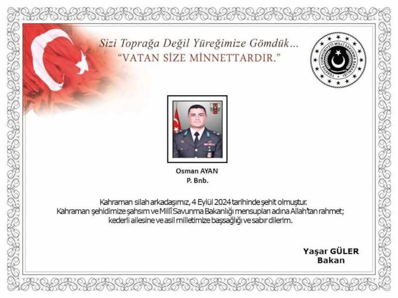 Binbaşı Ayan'ın yapılan tüm müdahalelere rağmen kurtarılamayarak şehit olduğu açıklanmıştı.