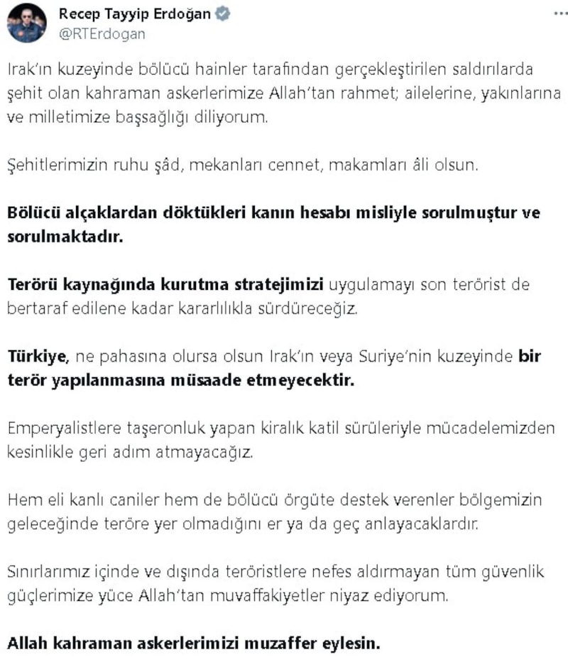 Irak'ın kuzeyin'de teröristlerin saldırısı sonucu şehit olan 6 askerimiz için CUmhurbaşkanı Recep tayyip Erdoğan, başsağlığı mesajı yayınladı.