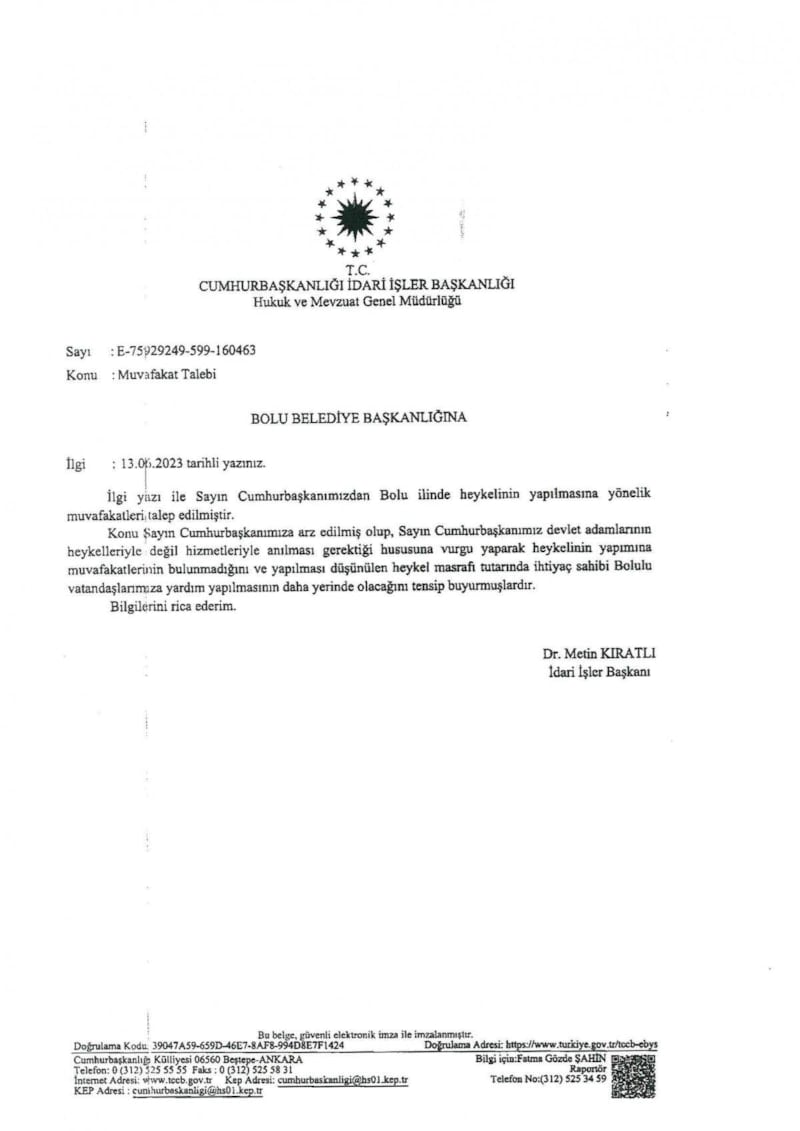 Özcan’ın mektubuna Cumhurbaşkanlığı İdari İşler Başkanı Metin Kıratlı imzasıyla cevap geldi. Cevap mektubunda Erdoğan, Bolu'ya yapılması planlanan heykeline onay vermedi.