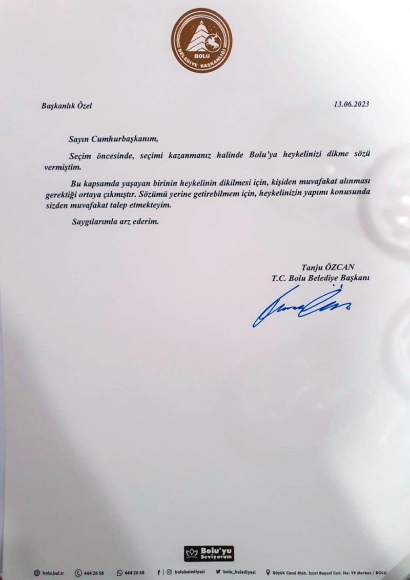 Seçim öncesinde, seçimi kazanmanız halinde, Bolu’ya heykelinizi dikme sözü vermiştim. Bu kapsamda yaşayan birinin heykelinin dikilmesi için, kişiden muvafakat alınması gerektiği ortaya çıkmıştır. Sözümü yerine getirebilmem için heykelinizin yapımı konusunda sizden muvafakat talep etmekteyim. Saygılarımla arz ederim.