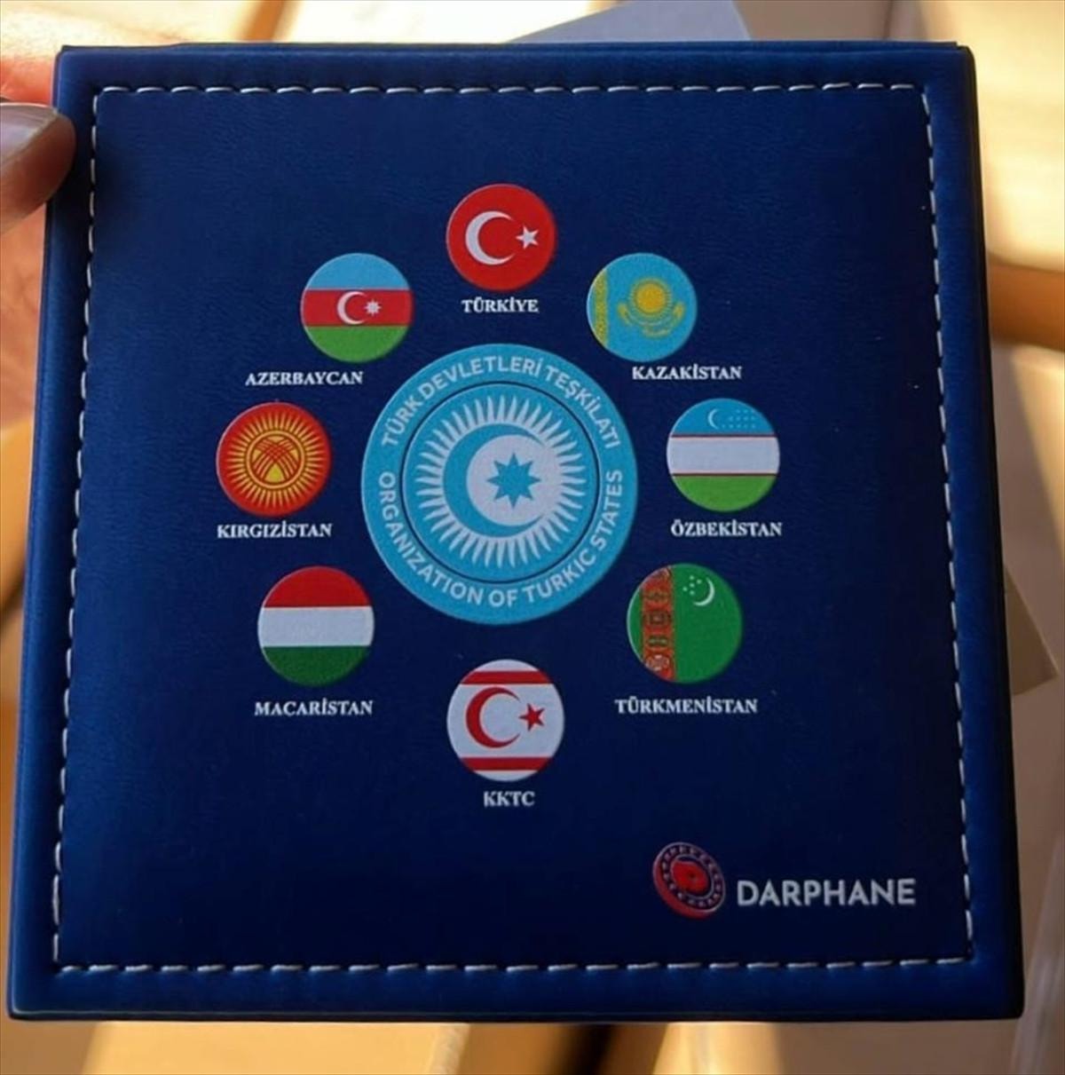 Türkiye, Kazakistan, Özbekistan, Türkmenistan, KKTC, Macaristan, Kırgızistan ve Azerbaycan'ın bayraklarının bulunduğu hatıra parada, "dilde, fikirde, işte birlik" ifadesi yer alıyor.