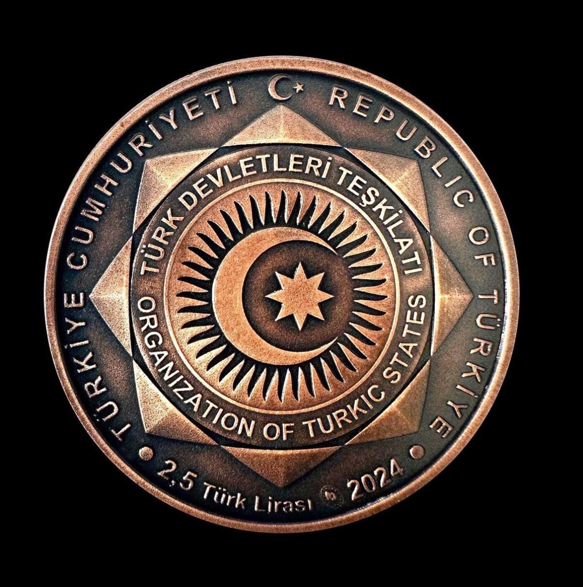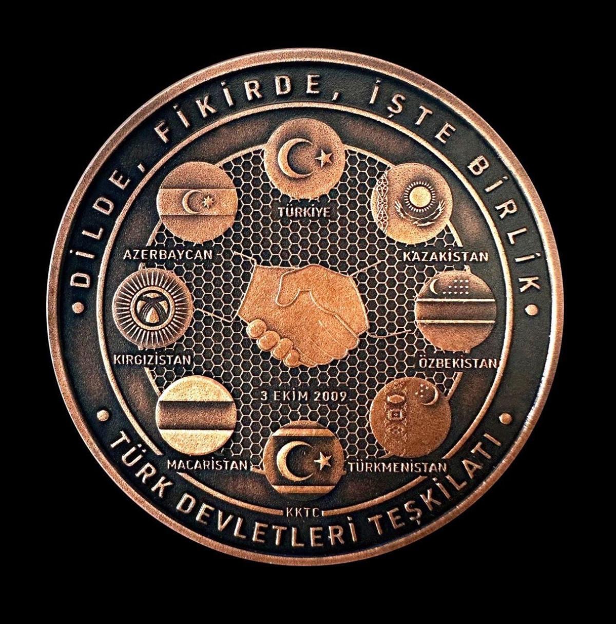 Hatıra paranın bir yüzünde ise Türk Devletleri Teşkilatı'nın bayrağı ve ismi ile kuruluş tarihi olan 3 Ekim 2009 ibaresi bulunuyor.