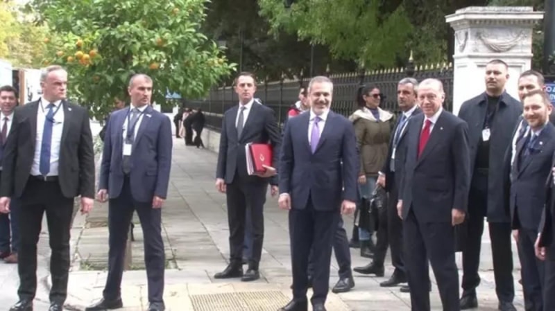 Erdoğan, kısa süreli konuşmanın ardından Kostidis'i eliyle selamlayarak yürümeye devam etti.