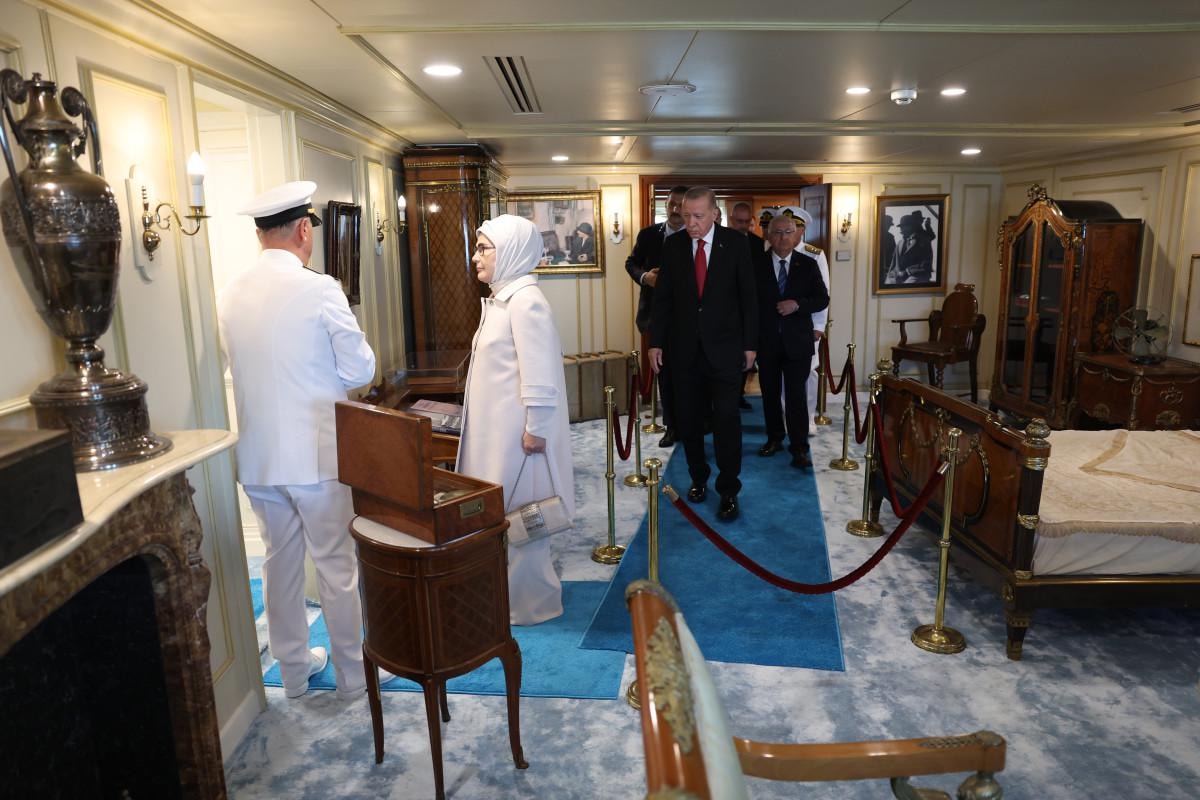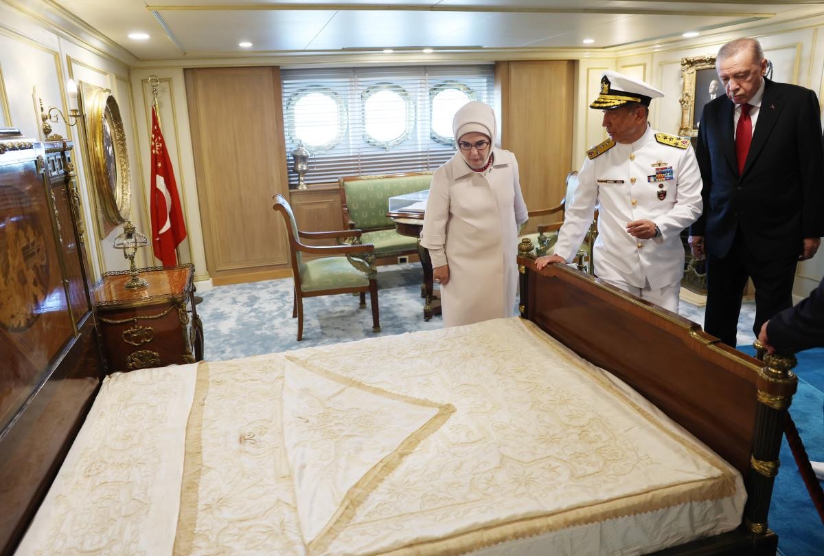 9 ay süren kapsamlı çalışmalarla aslına sadık kalınarak modernize edilen Savarona Yatı'nda incelemelerde bulunan Erdoğan, yapılan iyileştirme çalışmaları hakkında ayrıntılı bilgi aldı.