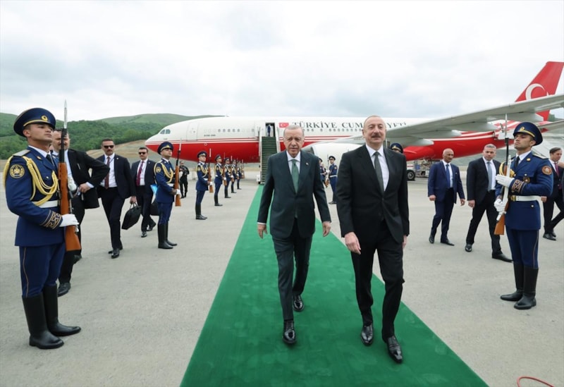 Erdoğan, Azerbaycan Cumhurbaşkanı İlham Aliyev ve Türkiye'nin Bakü Büyükelçisi Birol Akgün tarafından karşılandı.