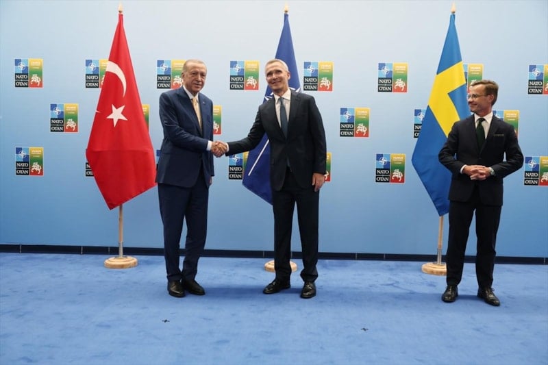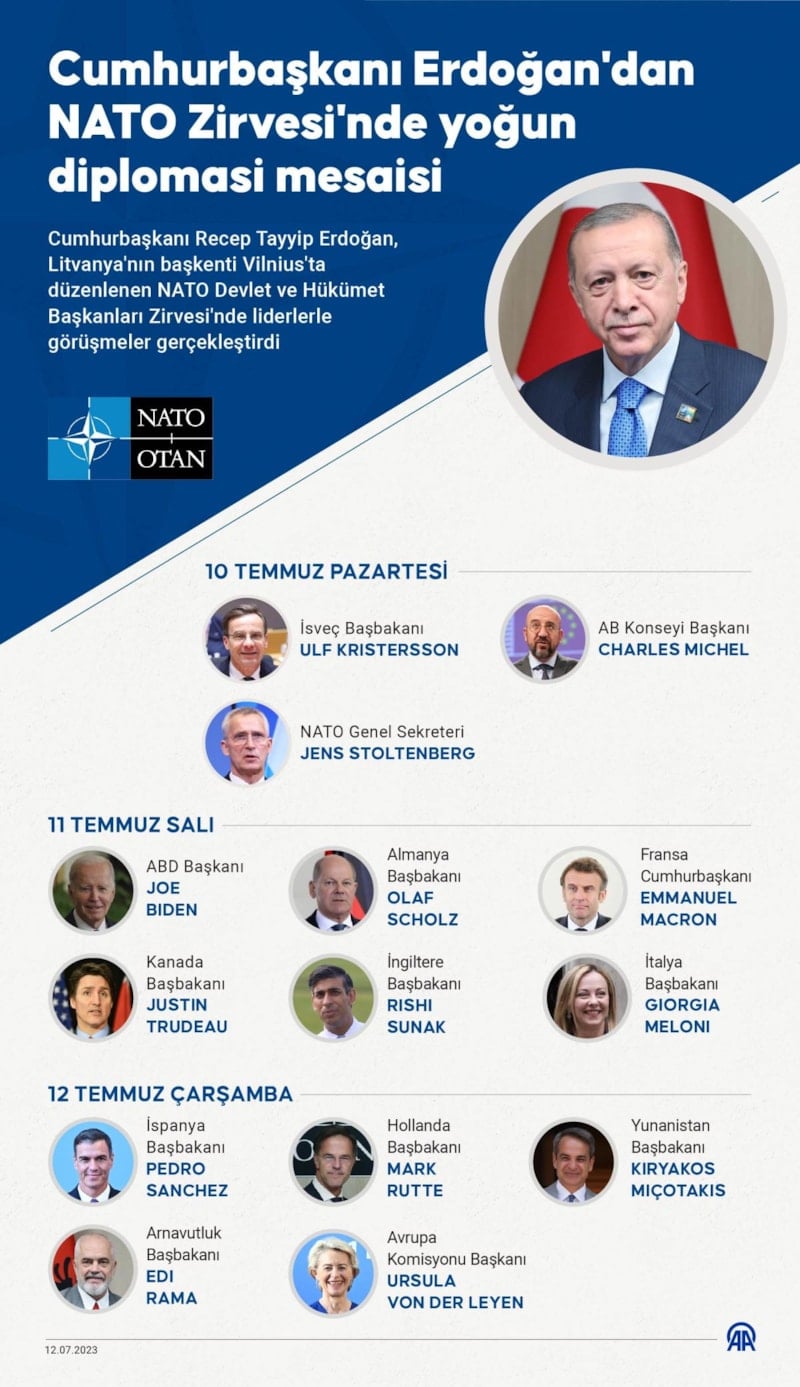 İlk olarak Vilnius’a gittiği ilk gün 10 Temmuz’da İsveç Başbakanı İsveç Başbakanı Ulf Kristersson ve NATO Genel Sekreteri Stoltenberg’in de yer aldığı üçlü görüşmeye katıldı.