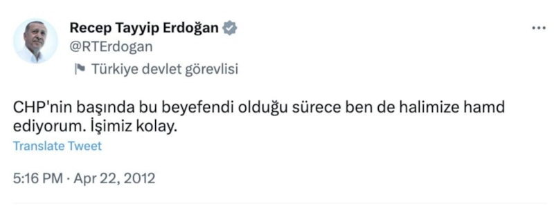 O dönem Türkiye Cumhuriyeti’nin Başbakanı olan Erdoğan’ın, yaptığı bir paylaşımda “CHP’nin başında bu beyefendi olduğu sürece ben de halimize hamdediyorum. İşimiz kolay.” ifadelerini kullandığı görüldü.