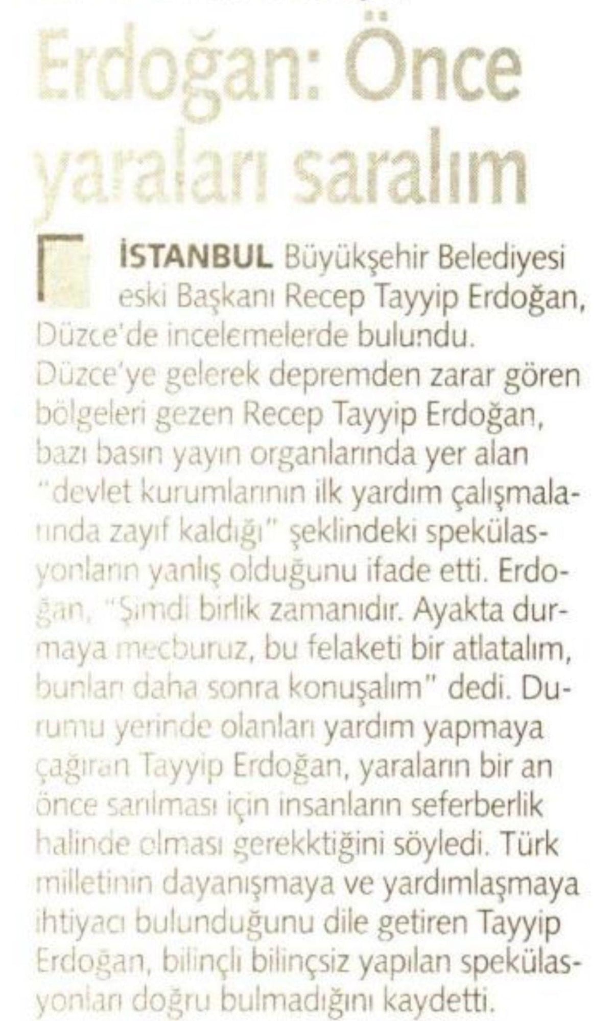 22 Ağustos 1999 tarihindeki bir gazetede yayınlanan haberde Cumhurbaşkanı Erdoğan'ın koalisyon hükümetine yönelik eleştirilere "Şimdi birlik zamanı, bu felaketi atlatalım öyle konuşuruz" dediği ortaya çıktı.