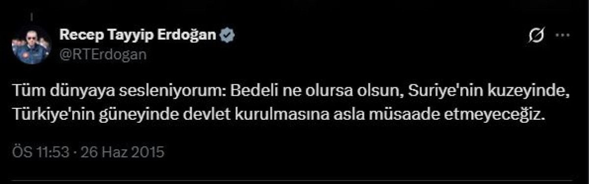 Buradan tüm dünyaya sesleniyorum, Suriye'nin kuzeyinde, güneyimizde bir devlet kurulmasına asla müsaade etmeyeceğiz. Bunun bilinmesini istiyorum. Bedeli ne olursa olsun bu konudaki mücadelemizi sürdüreceğiz.