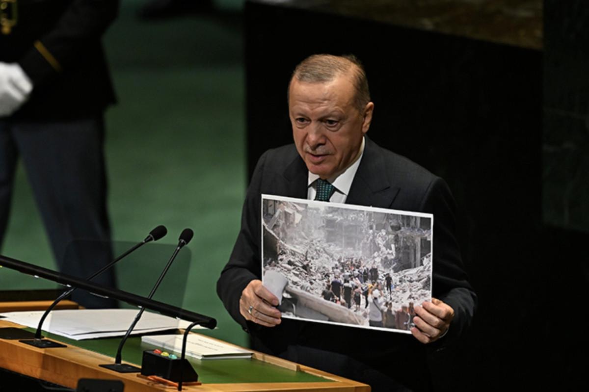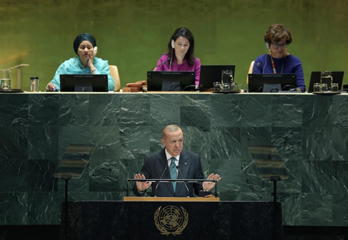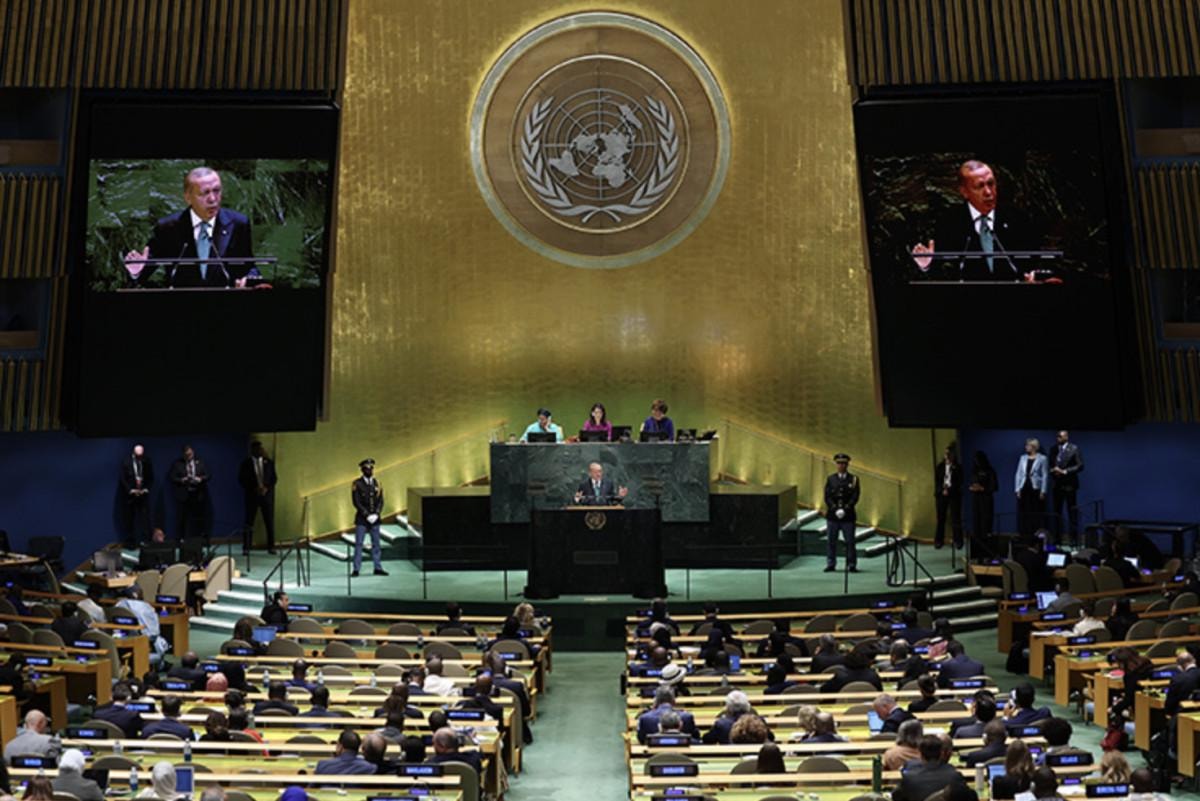"(BM) Genel Sekreter Sayın (Antonio) Guterres'in, Teşkilatımızı etkin ve verimli hale getirmek amacıyla başlattığı Birleşmiş Milletler 80 Girişimi'ne desteğimiz tamdır. Bu girişimin Birleşmiş Milletler'in tüm faaliyetlerini daha da güçlendirecek bir süreç olarak başarıya ulaşmasını temenni ediyorum. Bu sürece, İstanbul'u bir Birleşmiş Milletler merkezi haline getirme vizyonumuzdan da hareketle güçlü destek vermeye hazırız. 80'inci yılda Birleşmiş Milletler'i kuruluş ruhuna döndürecek adımları atmak hepimizin ortak sorumluluğudur. Biz, güçlünün haklı olduğu değil, haklının güçlü olduğu bir düzen kuruluna kadar 'Dünya beşten büyüktür' demeye devam edeceğiz. Görevimiz sistemi terk etmek değil, onarmak, yeniden işler hale getirmektir. Hiç şüphesiz, daha adil bir dünya mümkündür. Türkiye, 'daha adil bir dünyanın inşası' için mücadelesini sabırla devam ettirecektir."