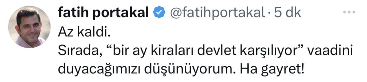 Onlardan biri olan Fatih Portakal'ın, "Az kaldı. Sırada, 'Bir ay kiraları devlet karşılıyor' vaadini duyacağımızı düşünüyorum. Ha gayret!" paylaşımı sosyal medya kullanıcılarının tepkisini çekti.