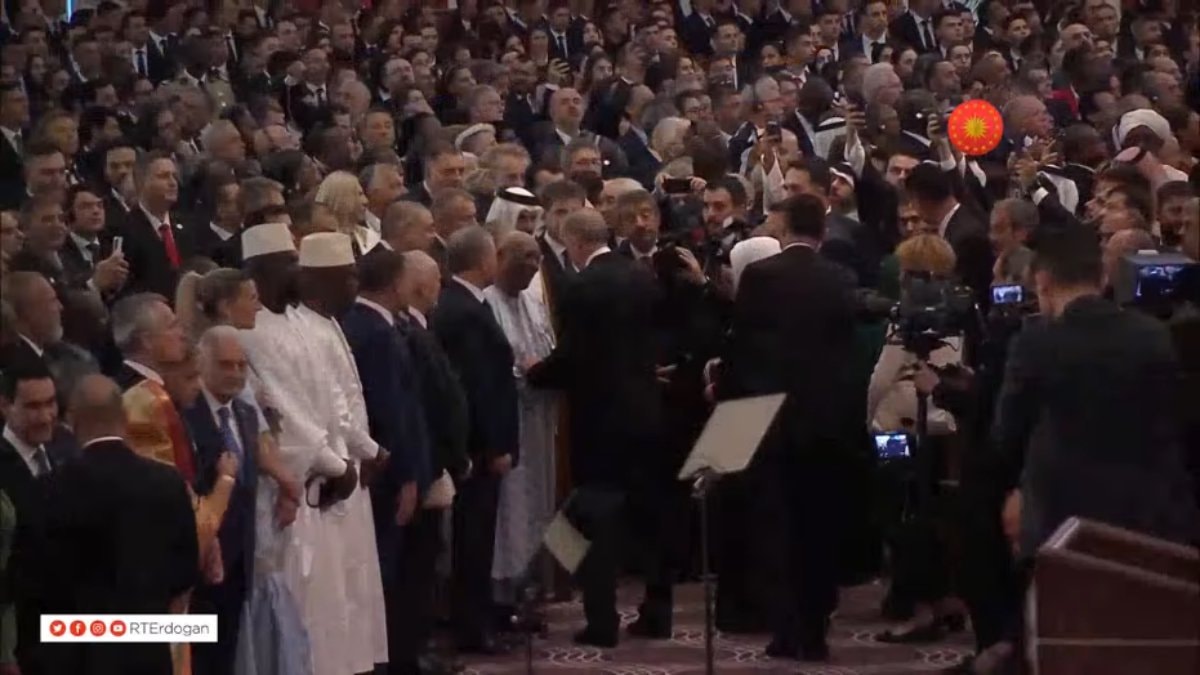 21 devlet başkanının, yüzlerce yabancı ülke temsilcisinin katıldığı görkemli tören salonuna gelen Erdoğan, liderleri tek tek selamladı.