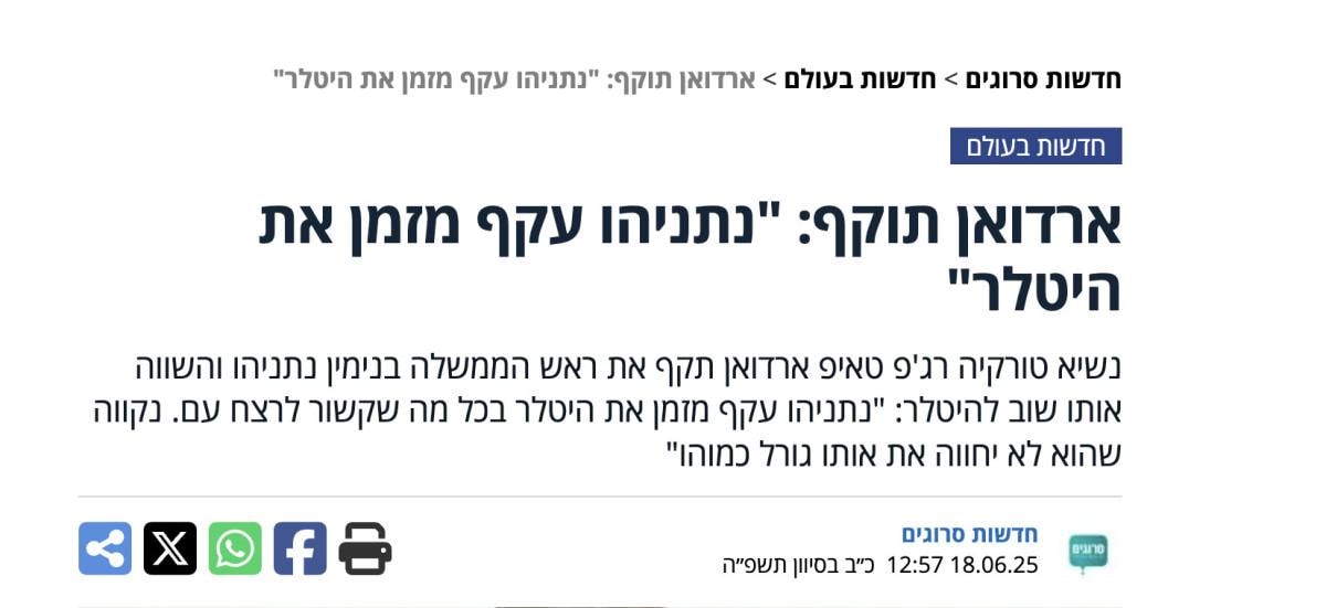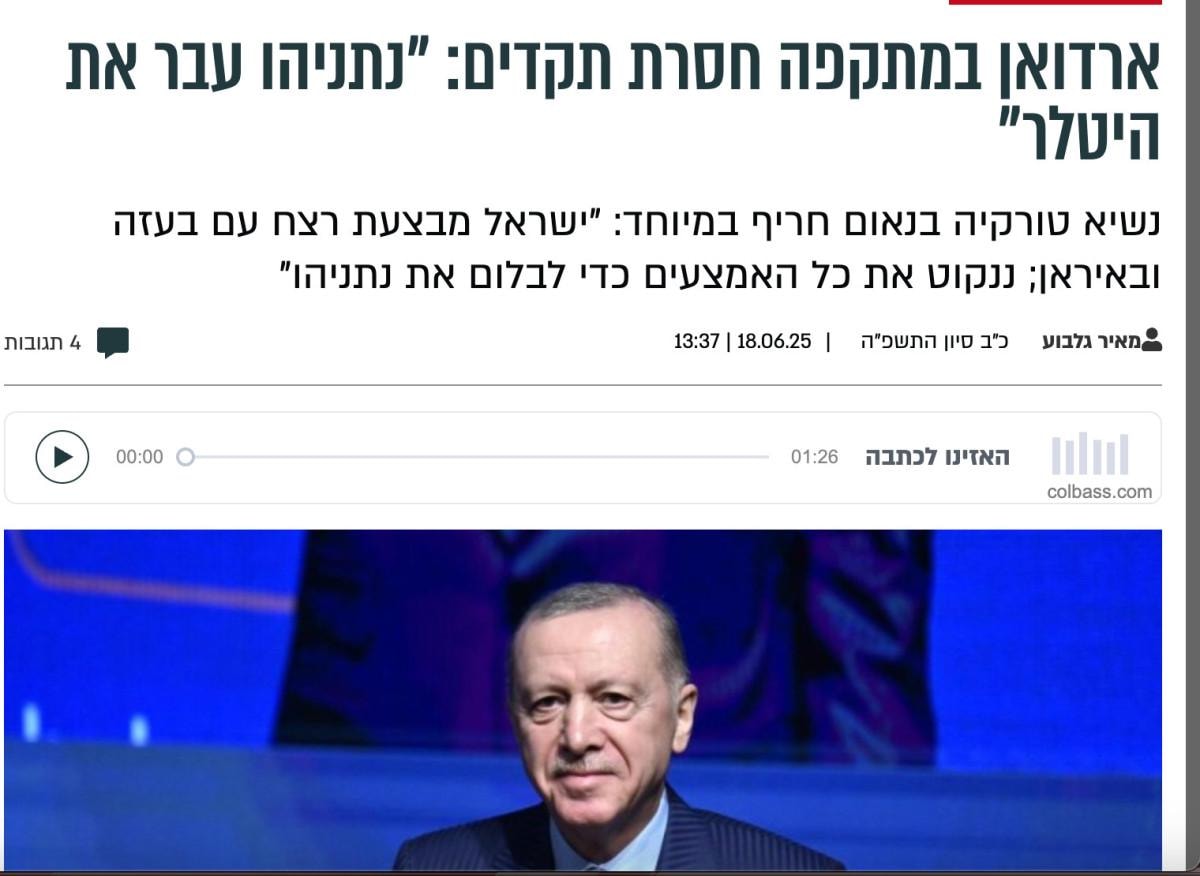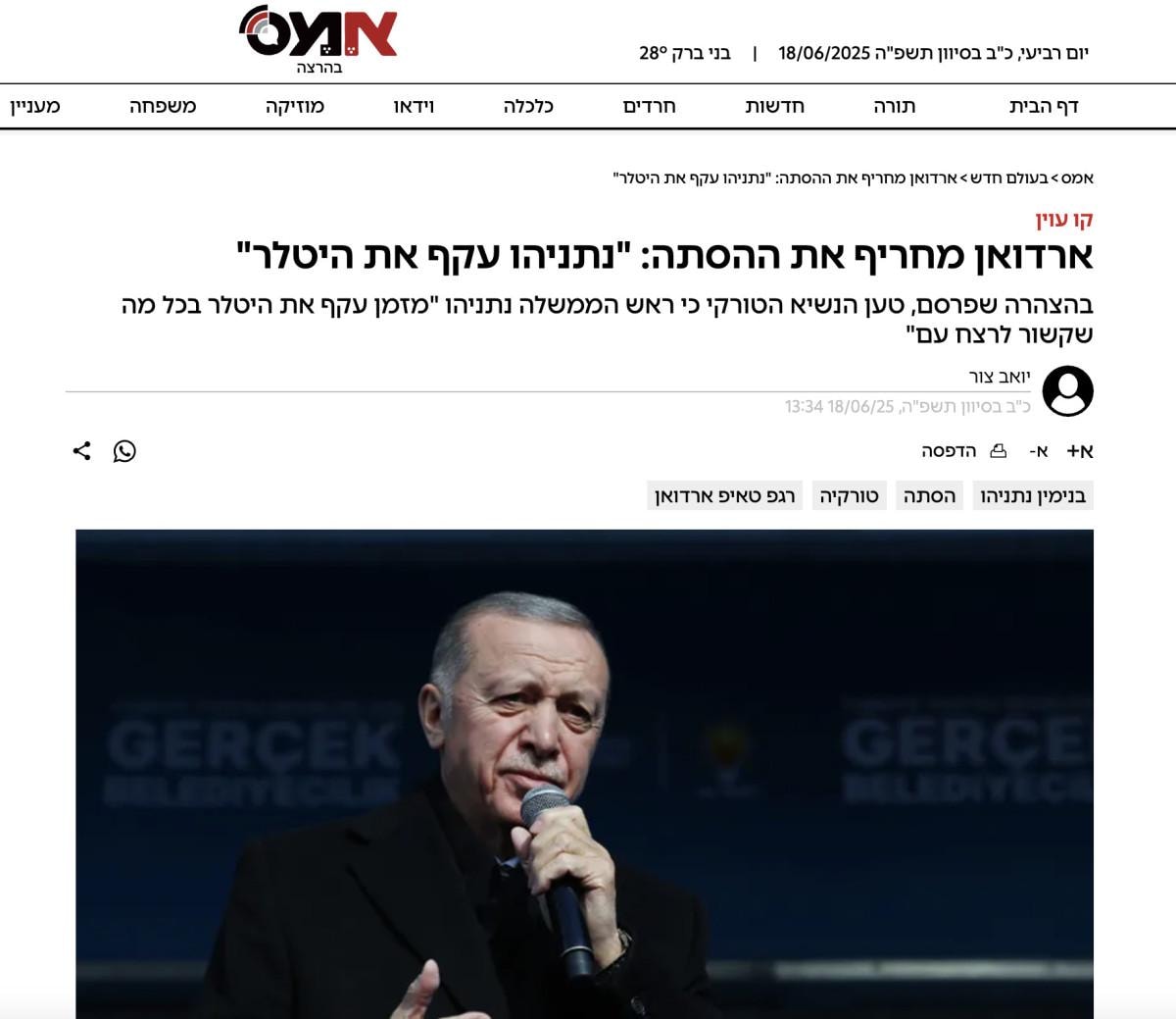İsrail merkezli Srugim haber sitesi, “Erdoğan Netanyahu'ya saldırdı: Hitler’i çoktan geçti” başlığıyla yayınladığı haberde, Cumhurbaşkanı Erdoğan’ın “Netanyahu soykırımda Hitler’i geçti, umarım onunla aynı kaderi yaşamaz.” sözlerine dikkat çekti.