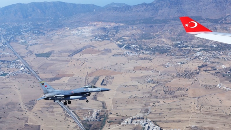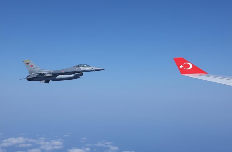 Cumhurbaşkanı Recep Tayyip Erdoğan'ın içinde bulunduğu "TUR" uçağına Kuzey Kıbrıs Türk Cumhuriyeti'ne (KKTC) varışında F-16'lar eşlik etti.