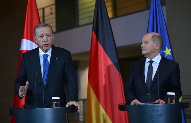 Almanya'ya 17 Kasım'da günübirlik çalışma ziyareti gerçekleştiren Erdoğan, Almanya Başbakanı Olaf Scholz ile düzenlediği ortak basın toplantısında, "Burada elimiz, kolumuz, dilimiz bağlı kalırsak, hesabını tarihe veremeyiz. Onun için bir borçluluk psikolojisi içerisinde İsrail-Filistin savaşını değerlendirmemek gerekir." dedi.