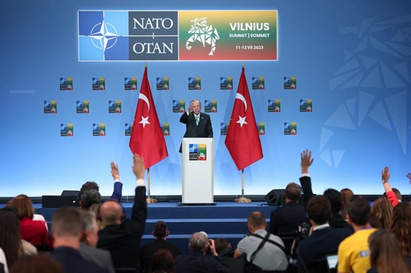 10 Temmuz'da Litvanya'nın başkenti Vilnius'a giden Erdoğan, NATO Devlet ve Hükümet Başkanları Zirvesi'ne katıldı. Körfez ülkeleri turu kapsamında 17-18-19 Temmuz tarihlerinde Suudi Arabistan, Katar ve Birleşik Arap Emirlikleri'ne ziyaretlerde bulunan Erdoğan, 20 Temmuz'da yeniden KKTC'ye gitti.