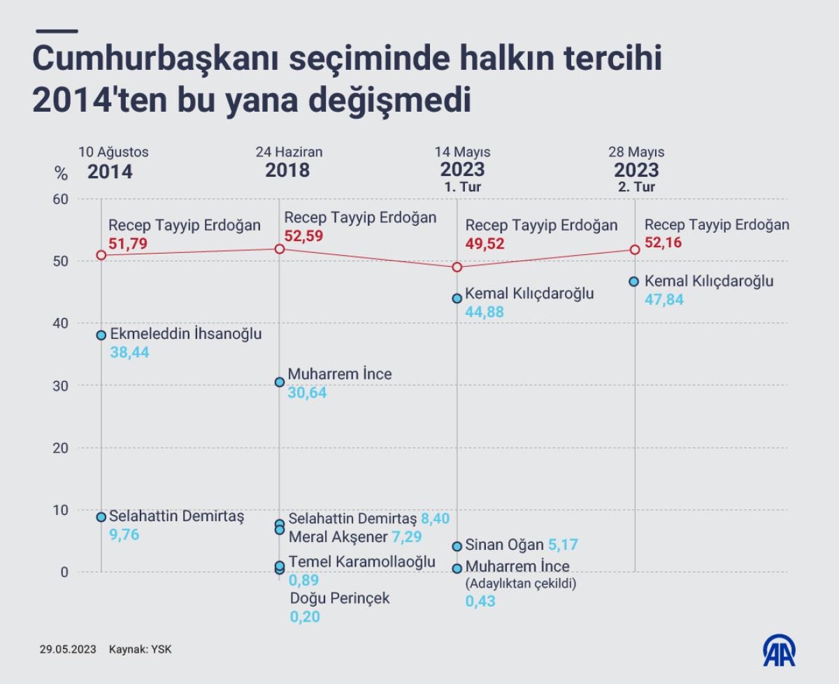 Cumhurbaşkanı Seçimi'nin ikinci turunda kesin olmayan sonuçlara göre, yüzde 52,16 ile 27 milyon 725 bin 131 oy alan Recep Tayyip Erdoğan, yeniden Cumhurbaşkanı olurken rakibi Kemal Kılıçdaroğlu ise yüzde 47,84 ile 25 milyon 432 bin 951 oy aldı.