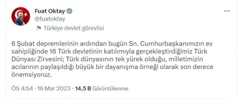 6 Şubat depremlerinin ardından bugün Sayın Cumhurbaşkanımızın ev sahipliğinde 16 Türk devletinin katılımıyla gerçekleştirdiğimiz Türk Dünyası Zirvesini; Türk dünyasının tek yürek olduğu, milletimizin acılarının paylaşıldığı büyük bir dayanışma örneği olarak son derece önemsiyoruz. Yaşanan bu büyük felakette kaybettiğimiz Kıbrıslı 35 yavrumuzla birlikte 49 bini aşkın vatandaşımızın her biri bizim canımızın bir parçasıdır. Her birine tekrar Allah'tan rahmet diliyorum, milletimizin başı sağ olsun.