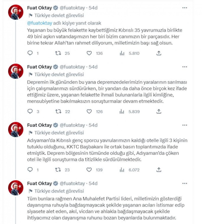 Sosyal medya hesabı üzerinden açıklamada bulunan Oktay, asrın felaketinde ihmali bulunanlarla ilgili soruşturmaların kimliğine bakılmaksızın sürdüğü belirtti: