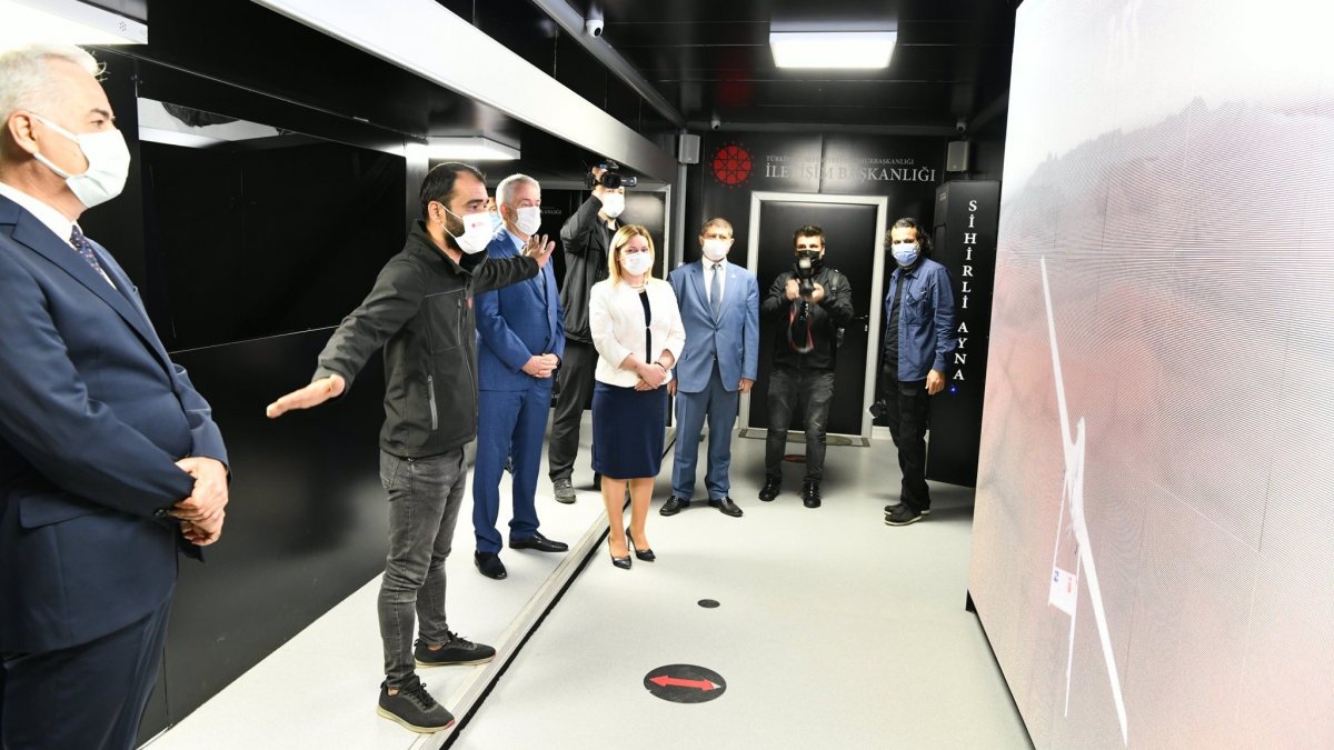 Cumhurbaşkanlığı İletişim Başkanlığı Antalya Bölge Müdürü Esen Diler’in de eşlik ettiği ziyarette Vali Seymenoğlu tır içerisindeki tüm istasyonları gezerek bilgi aldı, dijital sunumları dinledi.