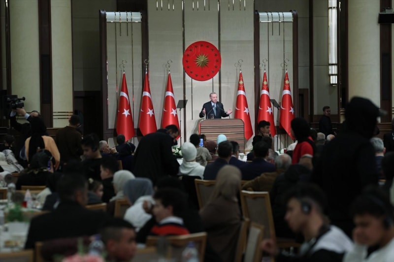 Üstad Necip Fazıl, orucu maddi ve manevi sayısız nimetin kaynağı olarak tarif ediyor. Tuttuğumuz oruçların, yaptığımız hayır ve ibadetlerin, ettiğimiz duaların maddi ve manevi nimetlerimizi arttırmasını, hayatımıza feyiz ve bereket katmasını canı gönülden temenni ediyoruz. Değerli dostlar, bugün Cumhurbaşkanlığı Külliyesi'nde büyük bir trajedinin son asrın en barbar soykırımlarından birinin mağdurlarını misafir ediyoruz. Gazze'nin vakur olduğu kadar yüreği yaralı evlatlarını milletin evinde bu gazi mekanda ağırlamaktan büyük bir memnuniyet duyuyorum. Teşekkür ederim.
