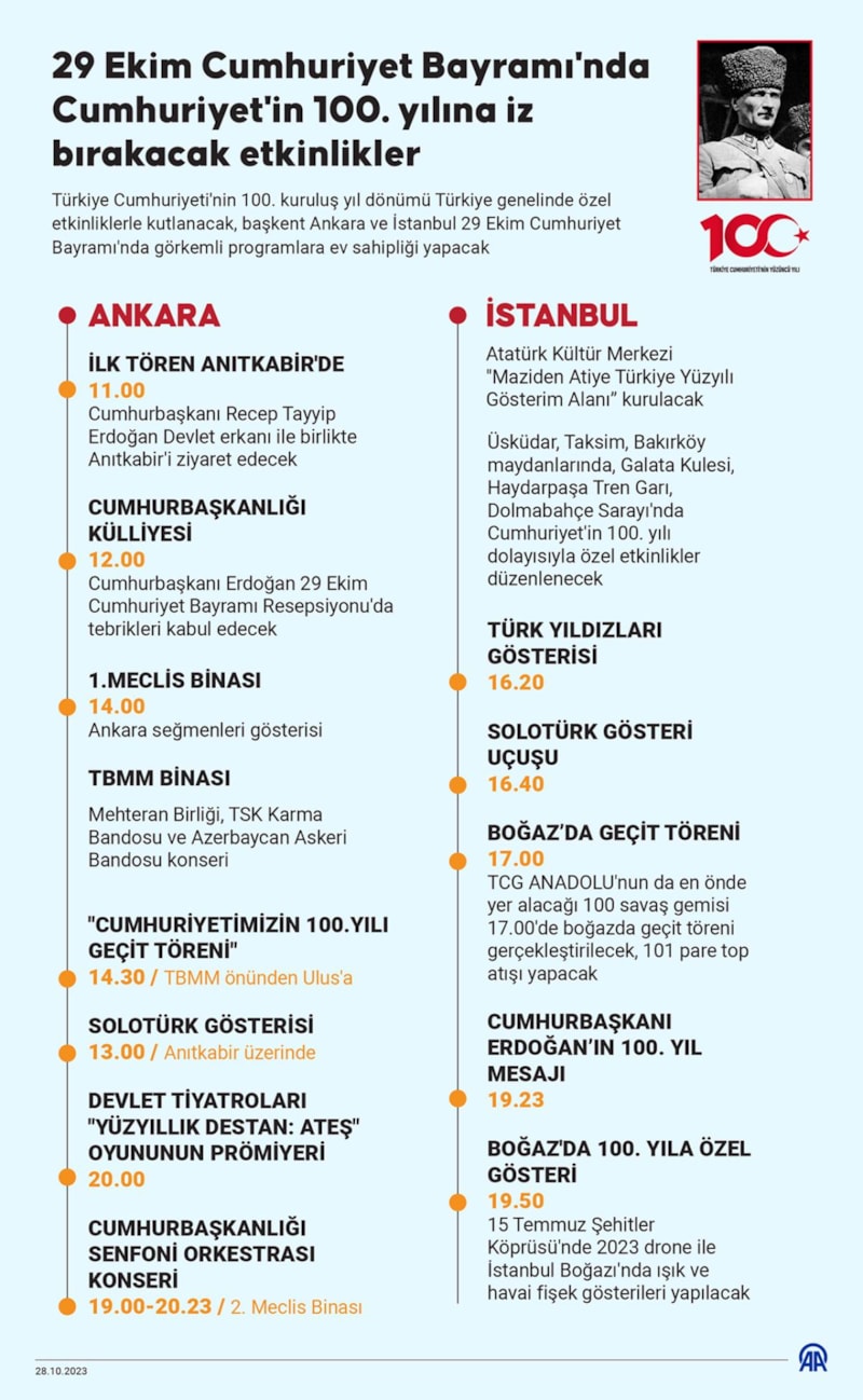 Cumhuriyet'in 100. yılı dolayısıyla Türkiye genelinde çok sayıda özel etkinlik düzenlenecek.
