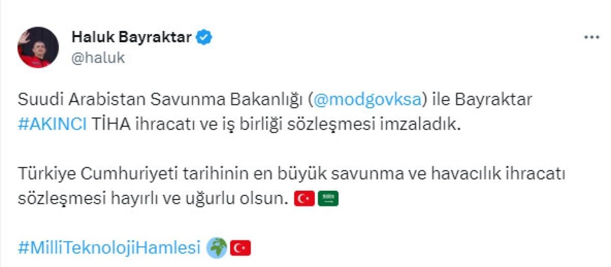 Suudi Arabistan Savunma Bakanlığı ile Bayraktar #AKINCI TİHA ihracatı ve iş birliği sözleşmesi imzaladık. Türkiye Cumhuriyeti tarihinin en büyük savunma ve havacılık ihracatı sözleşmesi hayırlı ve uğurlu olsun.