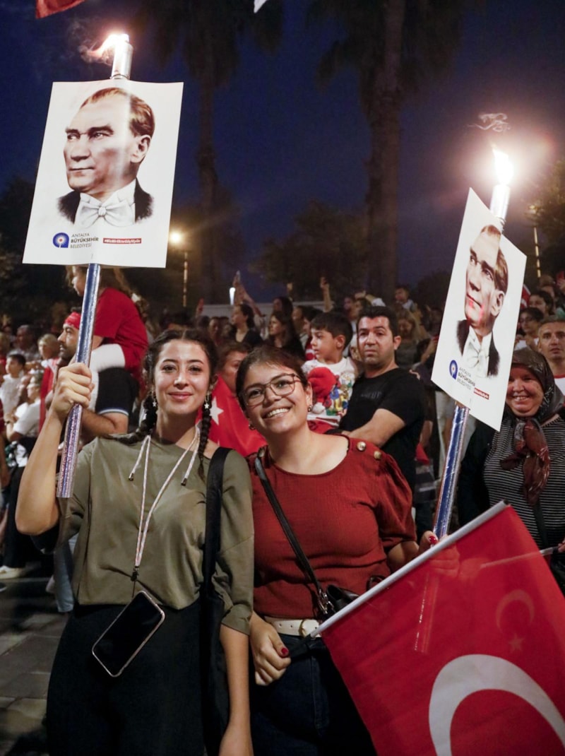 Konyaaltı Caddesi üzerindeki varyantta toplanan binlerce kişi, ellerinde cumhuriyetin kurucusu Mustafa Kemal Atatürk posteri, bayrak ve meşaleler ile yürüyüşe başladı. Cumhuriyet’in 100’üncü yılını kutlamak için güzergah boyunca marşlar söyleyen grupta çok sayıda çocuğun da olduğu görüldü. Yürüyüşe kimileri bebek arabalarıyla kimileri ise evcil hayvanlarıyla katıldı.