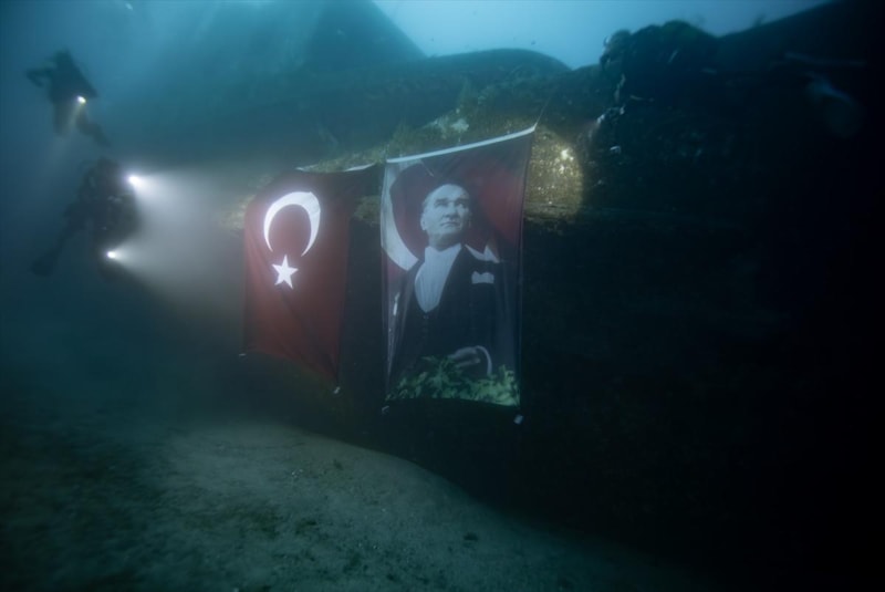 Dalgıçlar, ismini İzmir'in kurtuluş gününden alan vapurun batığına Türk bayrağı ve Atatürk posteri astı.