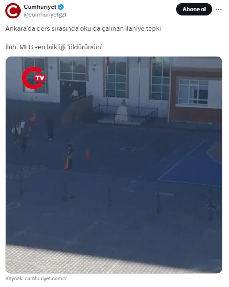 "Ankara’da ders sırasında okulda çalınan ilahiye tepki" başlığı ile servis edilen haber sosyal medyada "İlahi MEB sen laikliği öldürürsün" ifadeleriyle paylaşıldı.