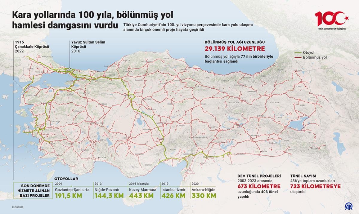 Cumhuriyet'in 100. yılının kutlanmasına sayılı günler kala, 1923'ten bu yana ulusal sınırlar içinde yürütülen projeler, Anadolu Ajansı tarafından derlendi.