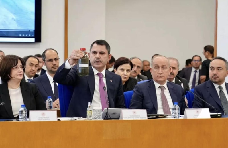 Çevre, Şehircilik ve İklim Değişikliği Bakanı Murat Kurum, TBMM Plan ve Bütçe Komisyonu’nda İzmir Körfezi’ndeki kirliliği denizden alınan numuneyle anlattı.